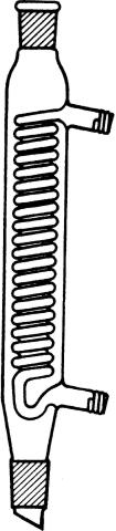 The surface area in these coil condensers is considerably greater than that in a Liebig condenser of similar external dimensions. They have a wide vapour passage and are free from external condensation of water vapour because the outer surface is air cooled. Extremely efficient when used for reflux.